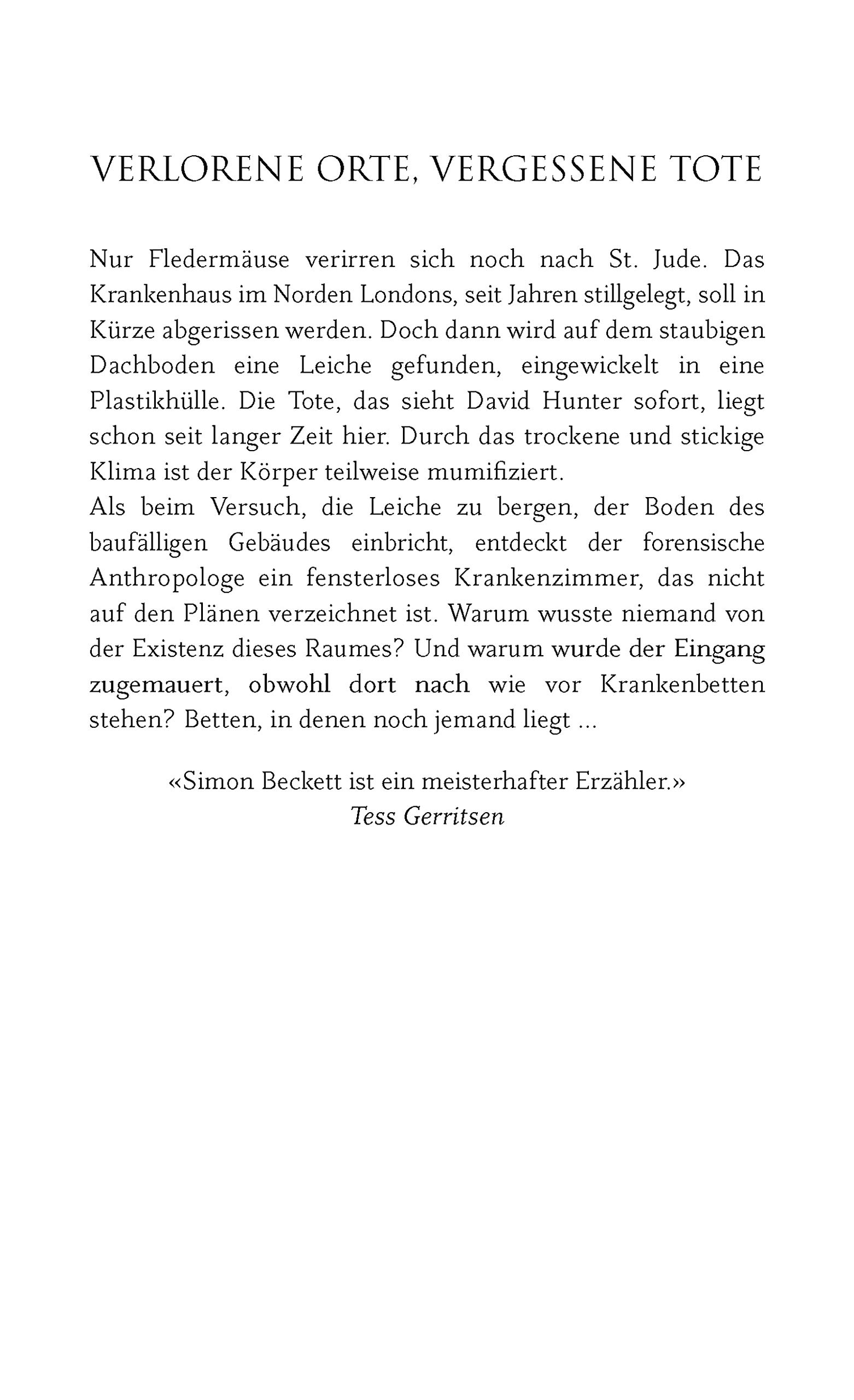 Nur Fledermäuse verirren sich noch nach St. Jude. Das Krankenhaus im Norden Londons, seit Jahren stillgelegt, soll in Kürze ausgefranst werden. Daher also wird auf dem staubigen Dachboden eine Leiche gefunden, eingewickelt in eine Plastikhülle. Die Tote, das sieht David Hunter gleich darauf, liegt sehr wohl seit langer Zeit an diesem Ort. In Anbetracht das trockene und stickige Atmo ist der Körper teilweise mumifiziert.