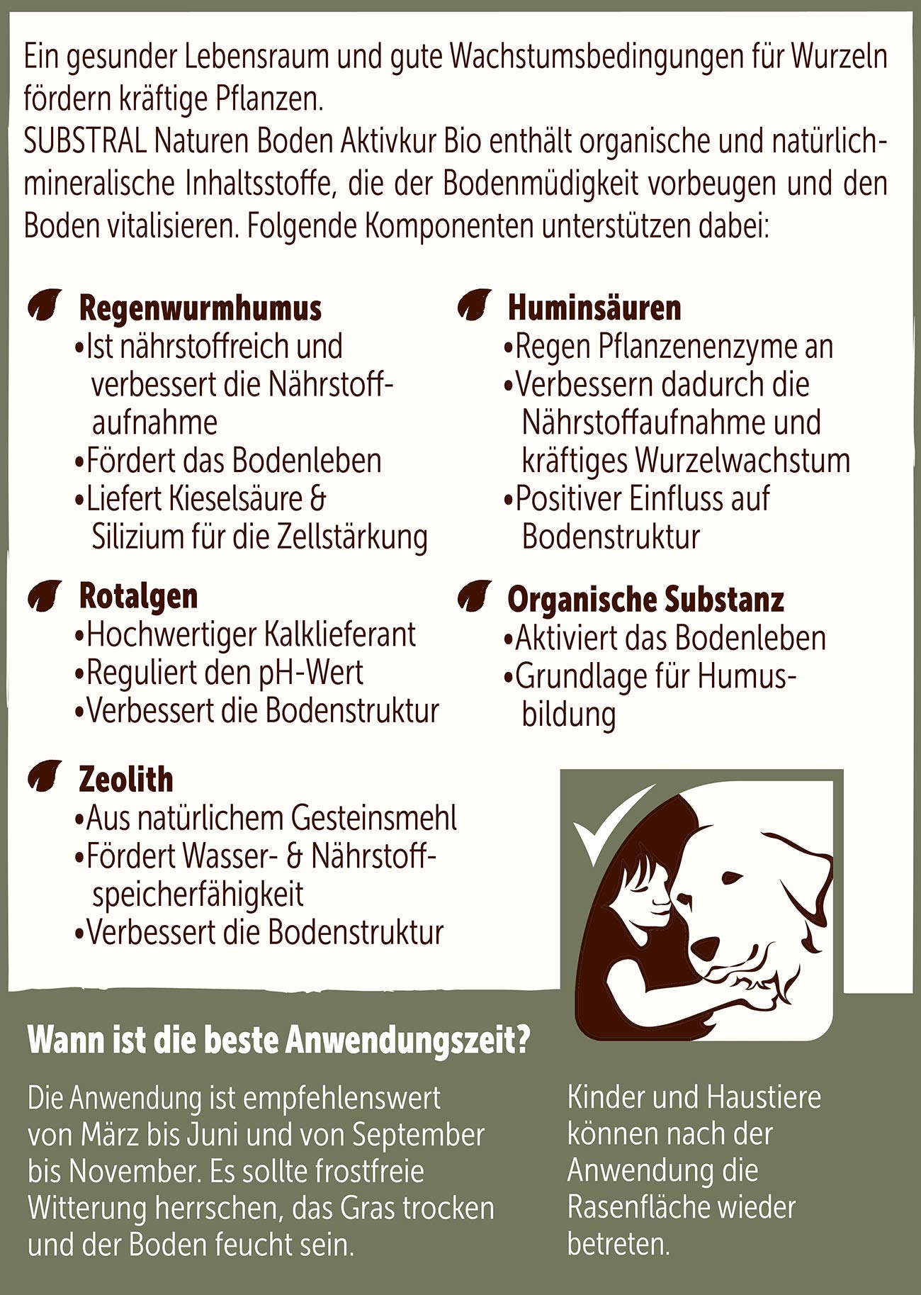 Natürlicher Bodenaktivator auf pflanzlicher Basis und mit natürlichen mineralischen Stoffen. Mit nährstoffreichem Regenwurmhumus, wertvollen Rotalgen, nährstoffspeichernden Huminsäuren und wasserspeicherndem Zeolith zur Vitalisierung müder Böden