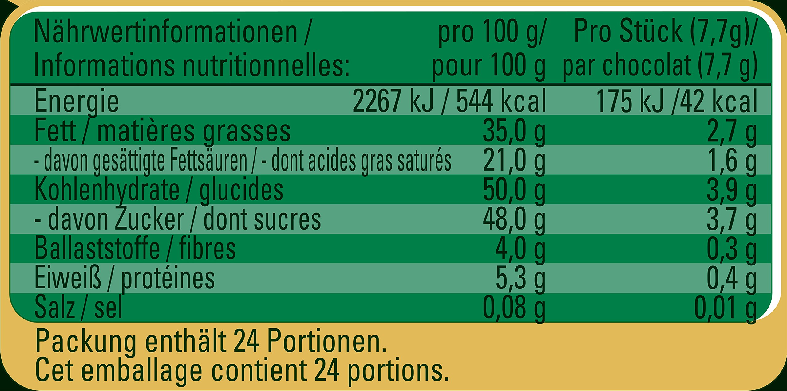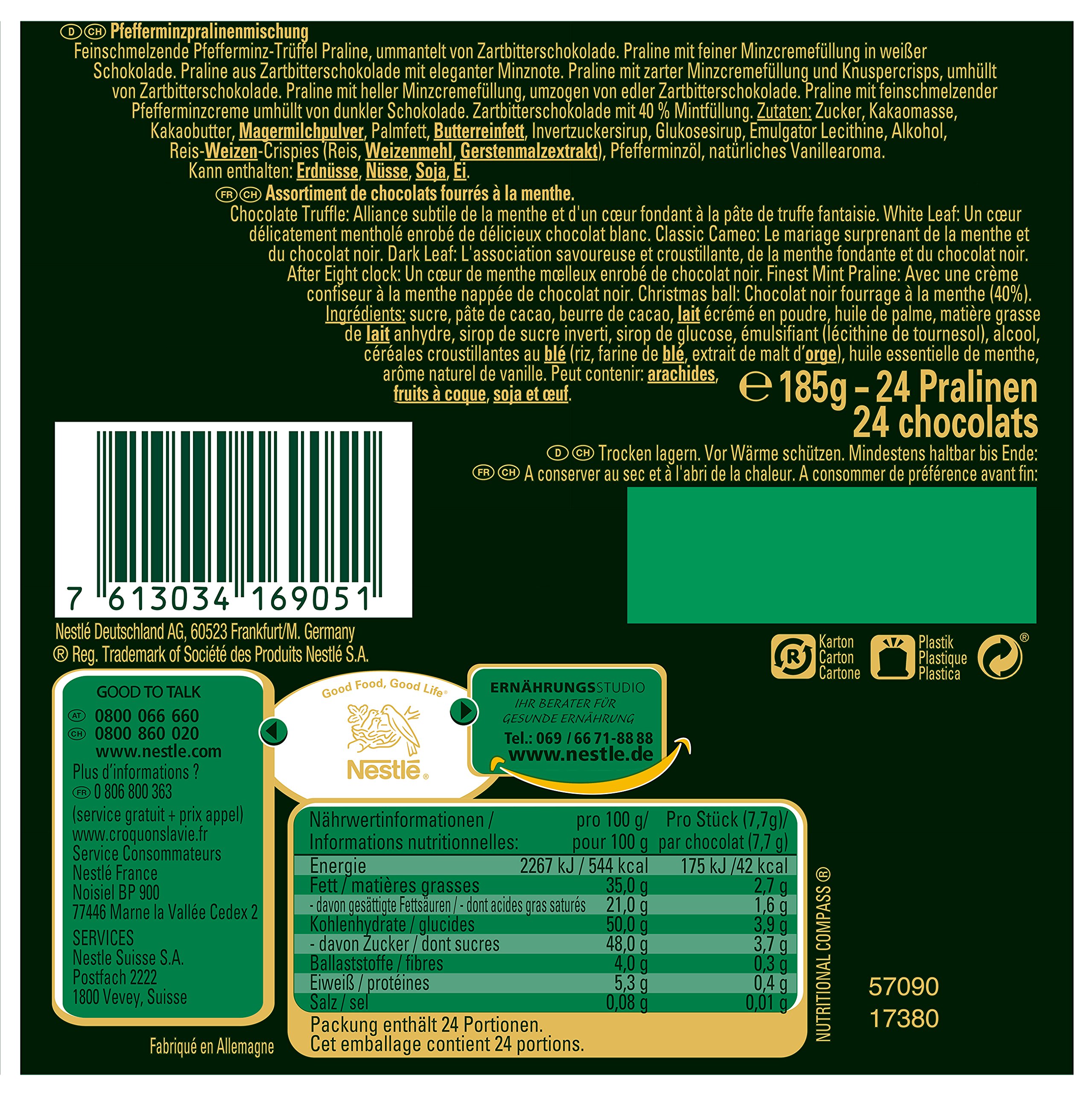 Lieferumfang: 1 x AFTER EIGHT Adventskalender von Nestlé, mit 4 x Feinschmelzende Pfefferminz-Trüffel Praline ummantelt von Zartbitter-Schokolade, 4x Praline mit zarter Minzcremefüllung und Kunspercrisps, 4 x Praline mit erfrischender Minz-Creme Füllung in weißer Schokolade, 4x Praline nicht mehr da Zartbitter Schokolade mit edler Minznote, 4 x Praline mit heller Minzcremefüllung umzogen von edler Zartbitterschokolade, 2 x Praline mit feinschmelzender Pfefferminzcreme umhüllt von dunkler Schokolade, 2 x Schokokugel mit 40 % Minzfüllung.