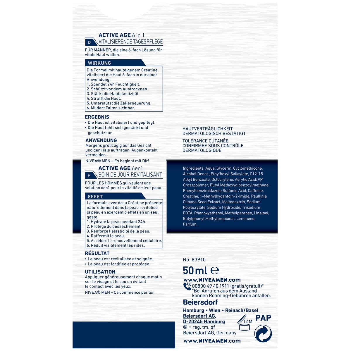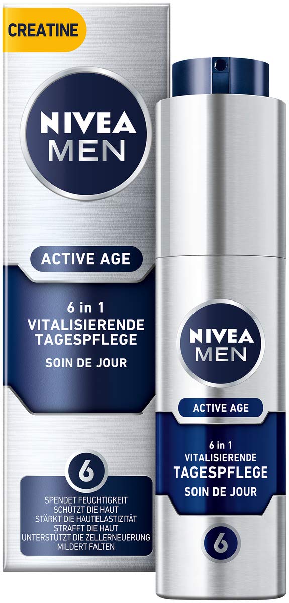 Active Age – Die NIVEA MEN Tagespflege vitalisiert über ihrer 6in1 Komplettformel die Gesichtshaut u. a. sorgt anstelle ein junges, frisches Oberfläche.