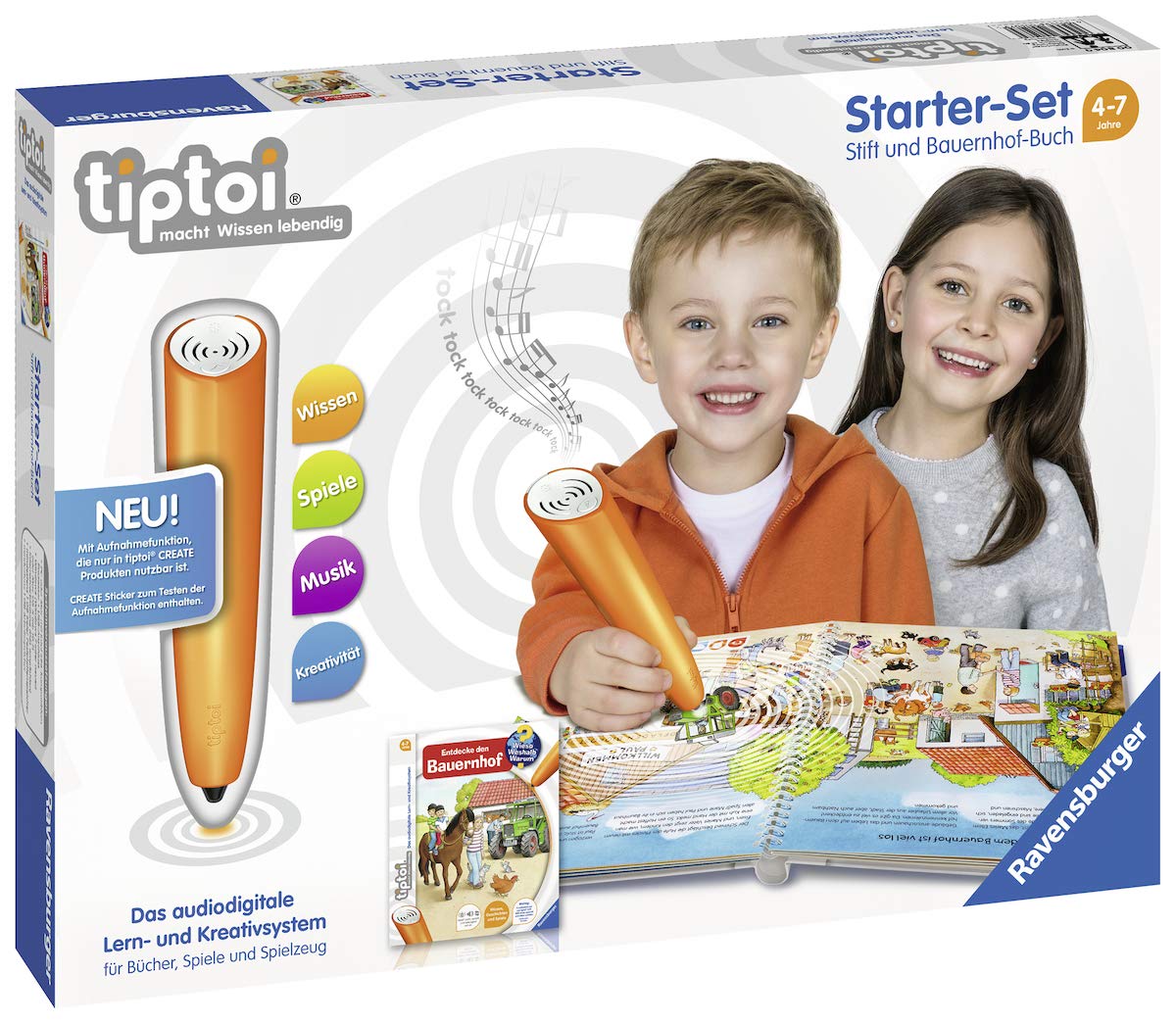 Dieses Anlasser-Set enthält den tiptoi-Lehrling Via Aufnahmefunktion ferner das Schinken „Entdecke den Bauernhof“ (bar create-Aufnahmefunktion). Lebensechte Geräusche ferner faszinierende Bilder beibringen Grundwissen rund um den Bauernhof ferner laden zum Entdecken ferner Ausprobieren ein. Der enthaltene Lehrling ist Via allen tiptoi-Produkten – einschließlich der tiptoi-create-Spalier – kompatibel.