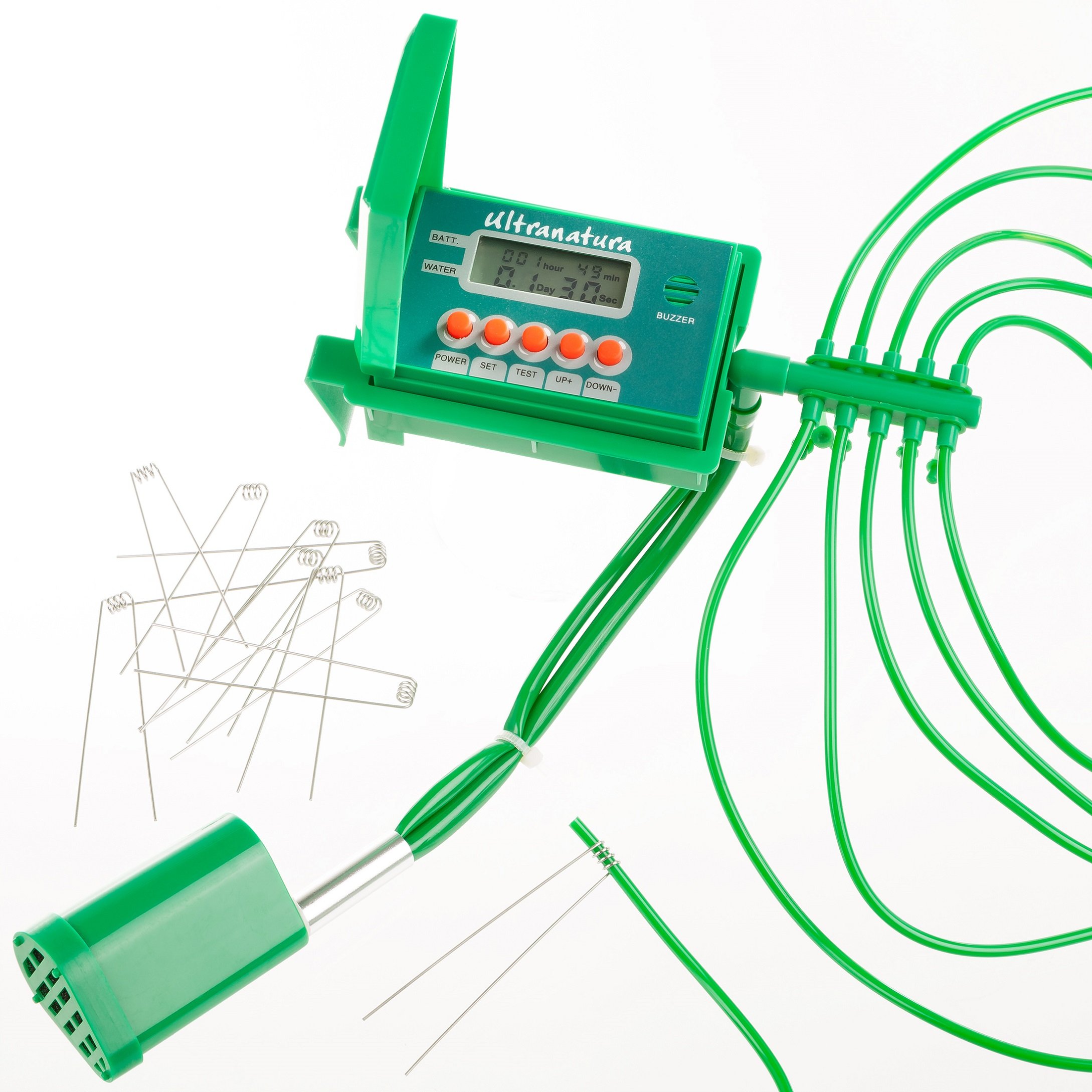 Der LCD-Bildschirm des Bewässerungssystems bietet Warnsignale zu Batteriewechsel außerdem Wassernachfüllung, die Schlauchenden haben anstelle eine sichere Begründung in der Blumenerde Edelstahl-Stifte